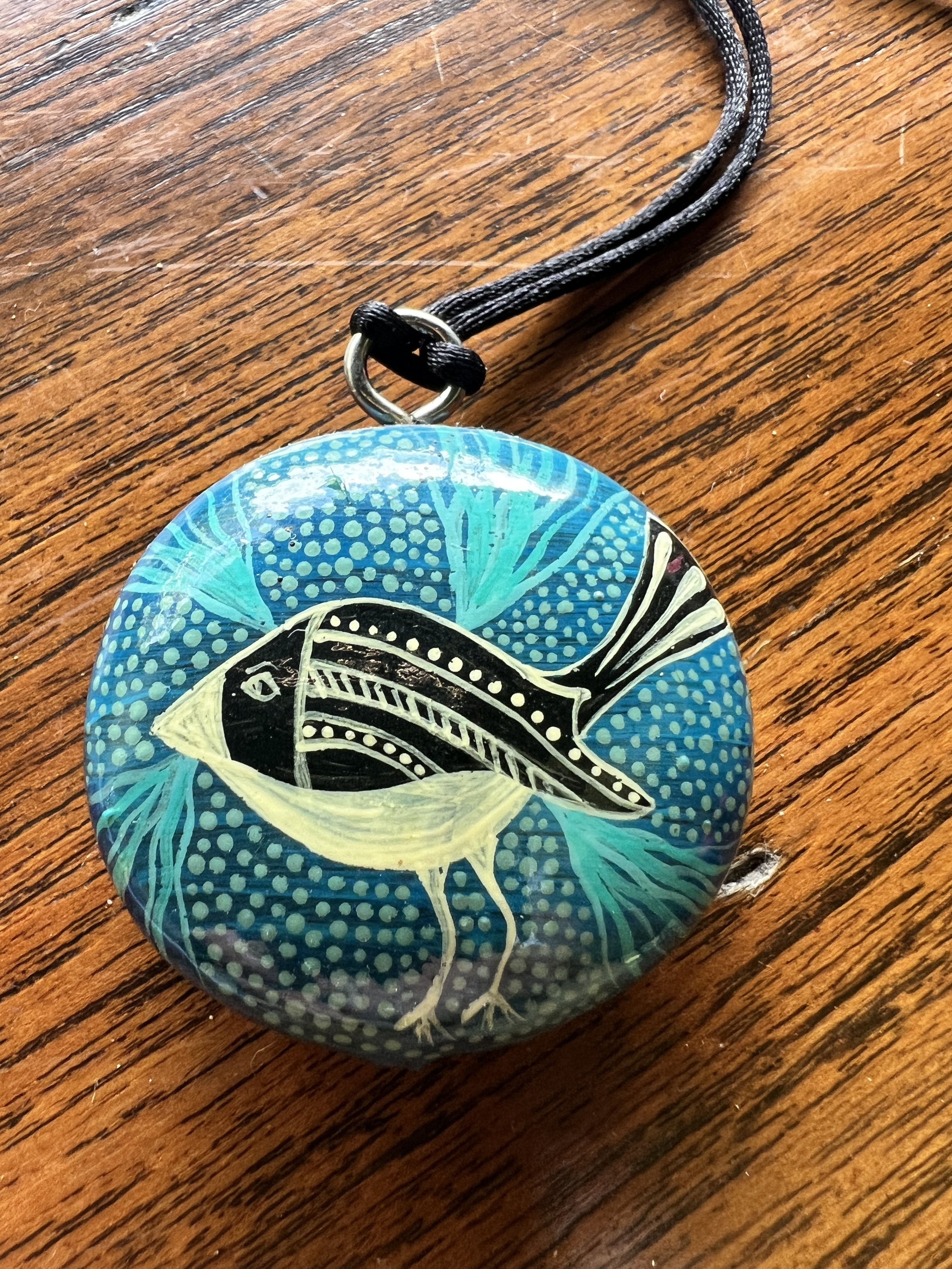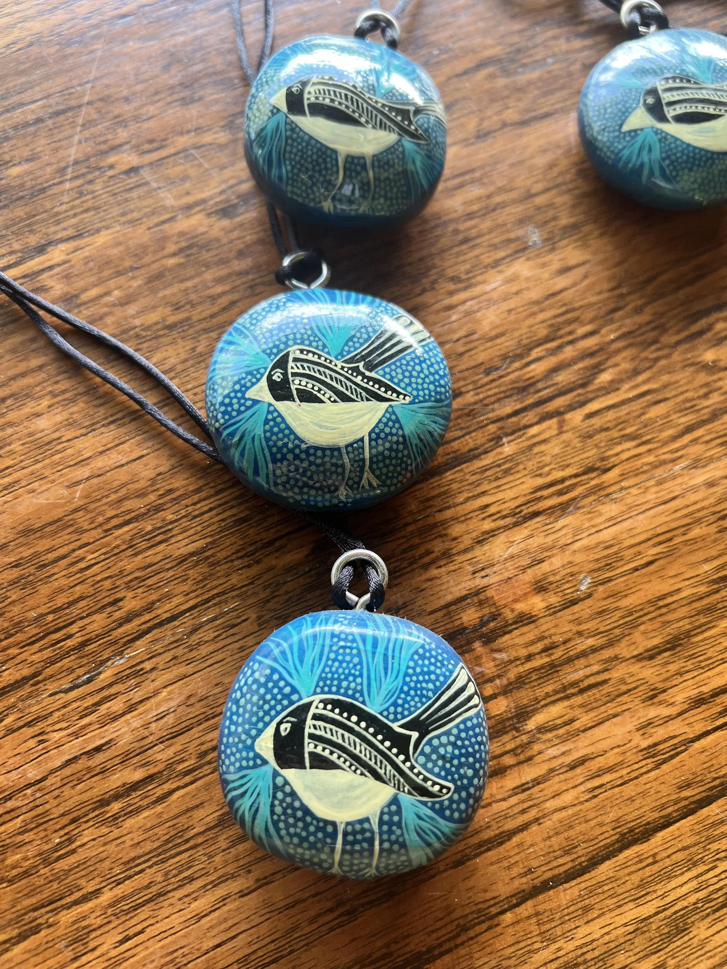 Dijarr Dijin is a bespoke pendant featuring an intricate hand-painted willy wagtail on a matchbox bean, with your choice of adjustable cord.