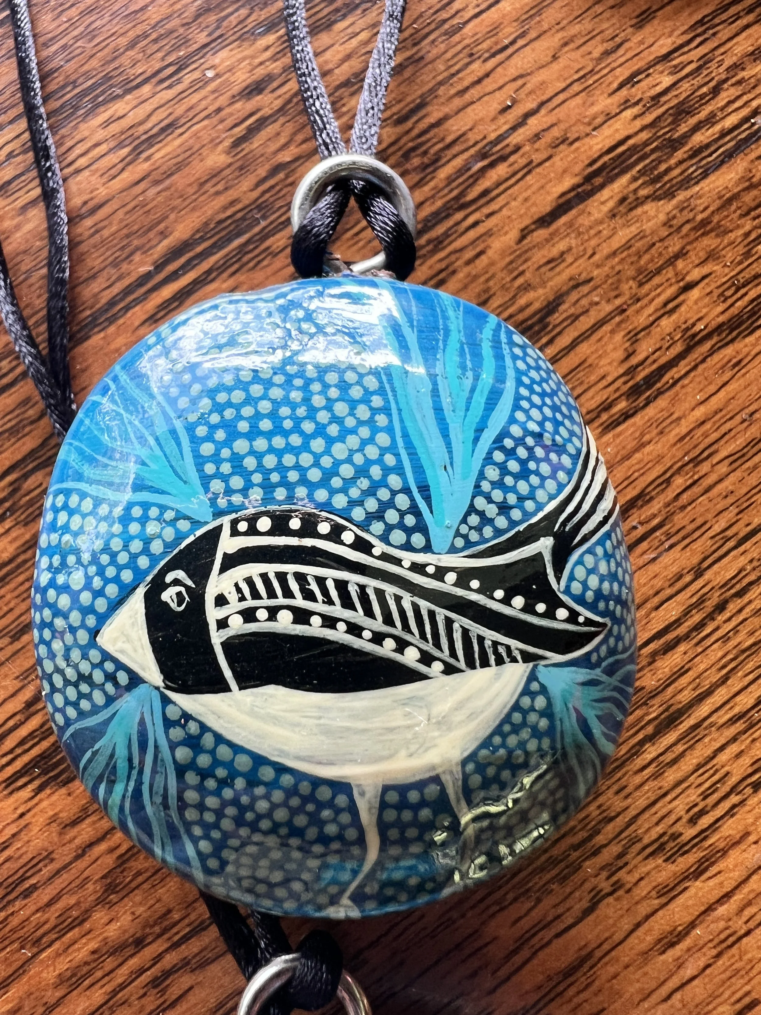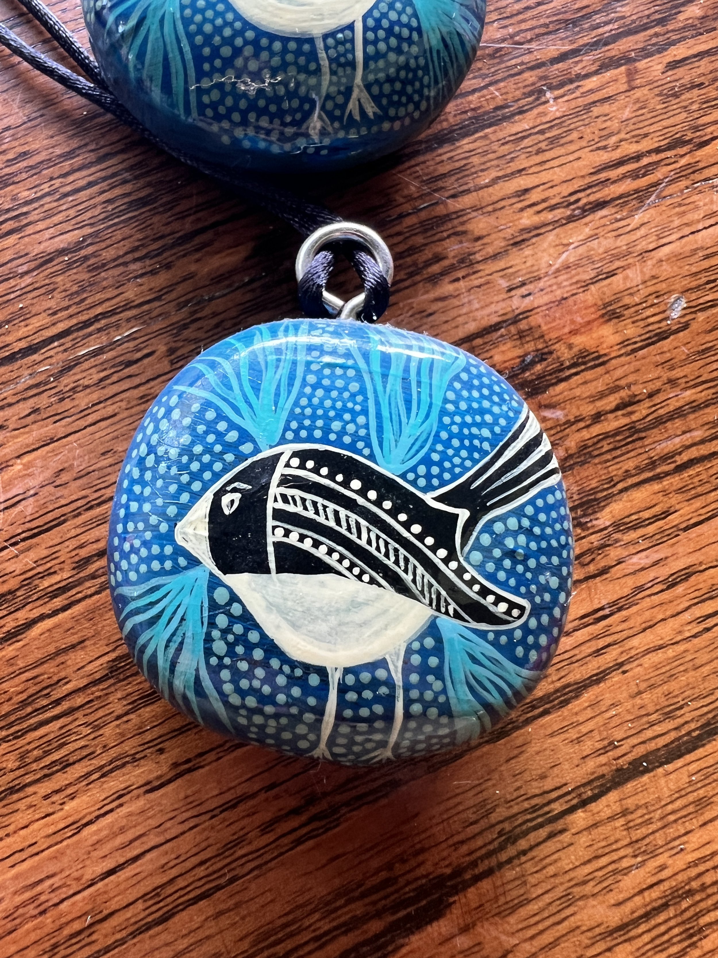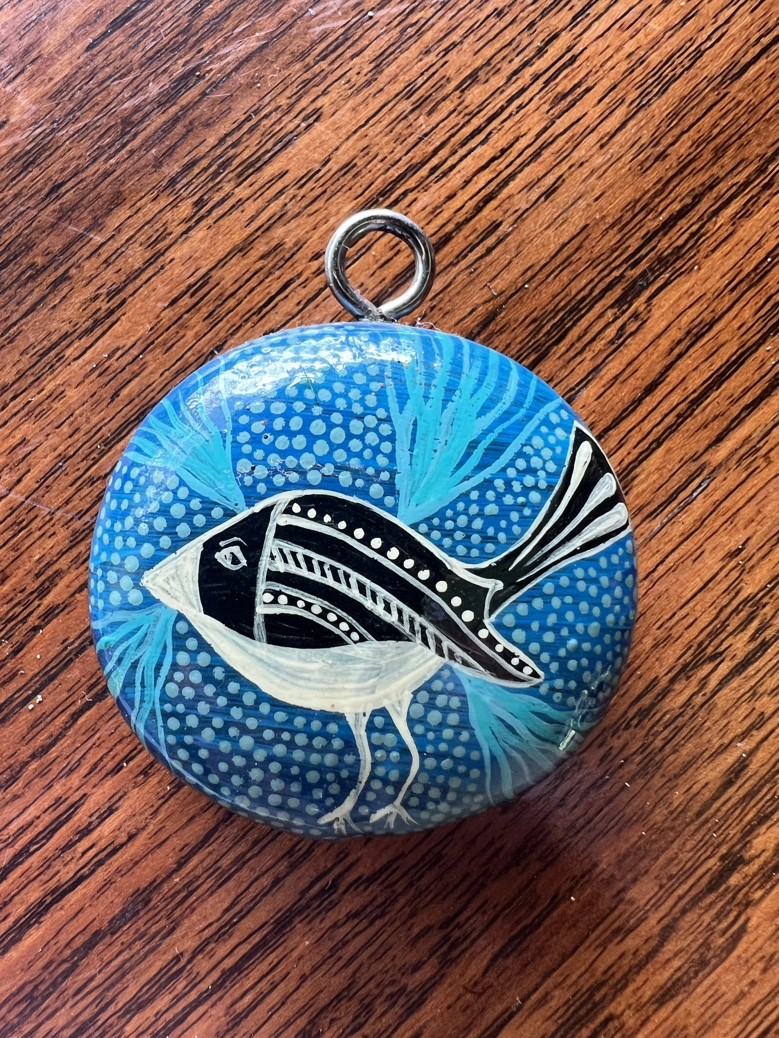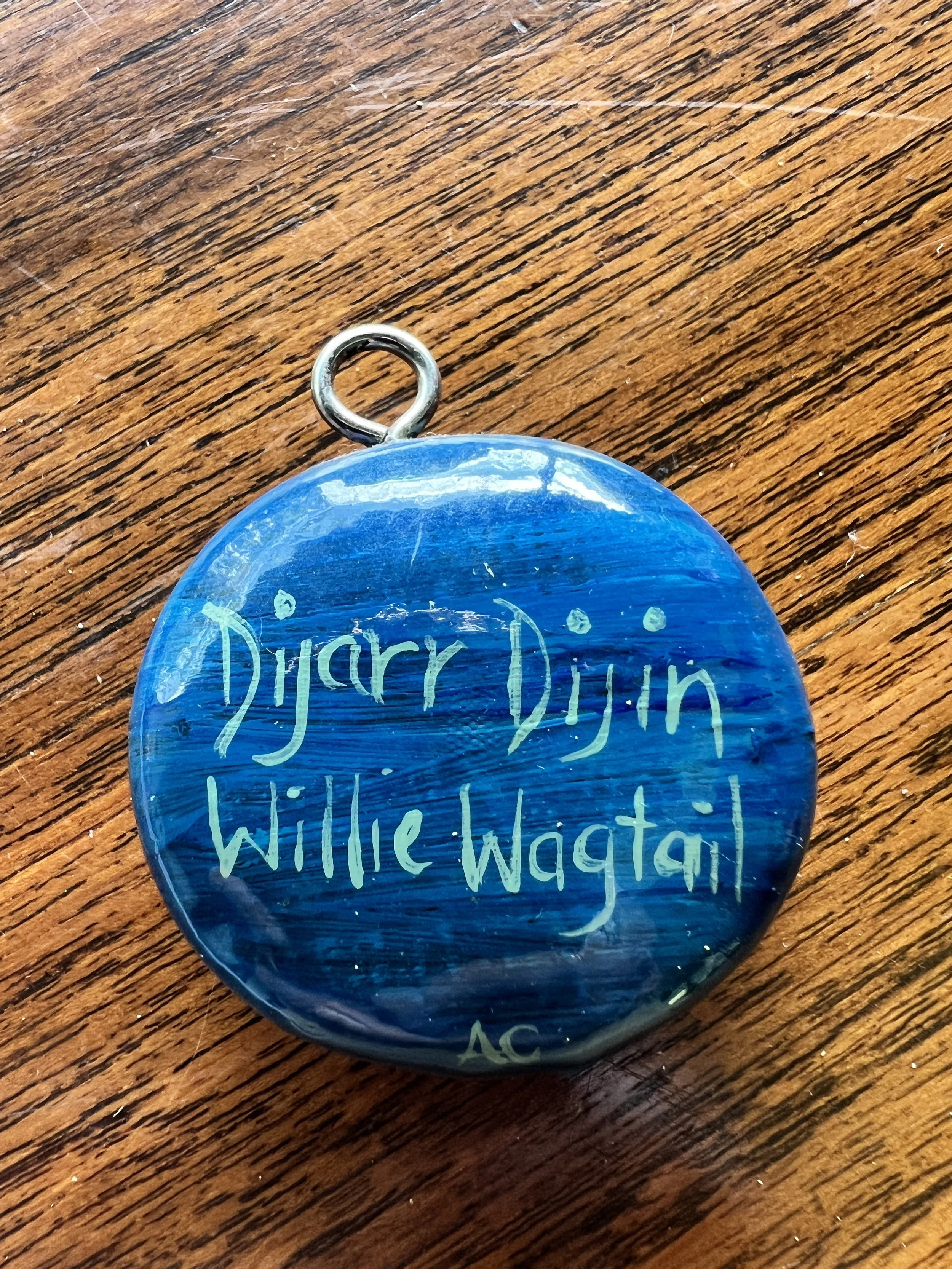 Dijarr Dijin is a bespoke pendant featuring an intricate hand-painted willy wagtail , with a removable silver key ring tag.