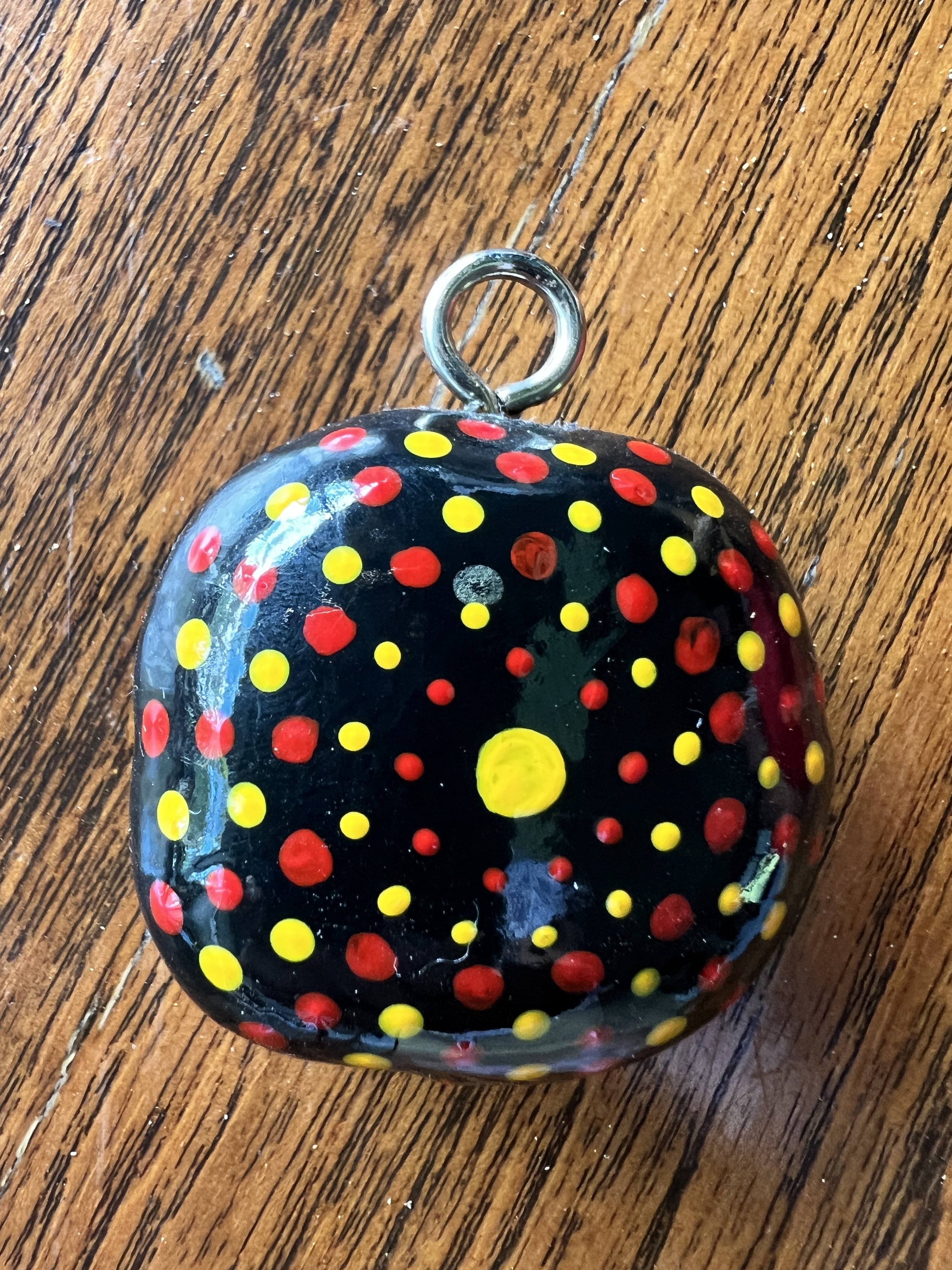 Renewal is a bespoke pendant featuring an intricate hand-painted mandala of calming ochre tones on a matchbox bean, with a removable silver key ring tag.